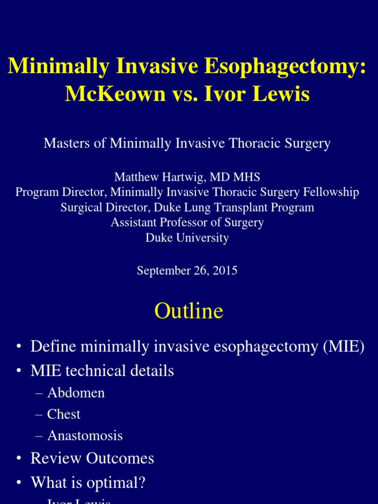 It is most often performed for esophageal cancer, a condition in which malignant (cancerous) tumors develop in the esophagus mckeown. Minimally invasive esophagectomy (mie) has consistently been associated with improved perioperative outcome and similar oncological safety compared to open esophagectomy.